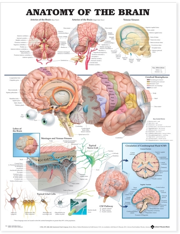 Anatomy of the Brain with illustrations by renowned medical illustrator Keith Kasnot is one of our most popular charts. Beautiful, clear illustrations make the structures of the brain come alive . All illustraions are clearly labeled and vividly colored. Illustrations include: Central image showing major structures, cerebral hemispheres and key cranial nerves Arteries of the Brain (base and right side views) Venous Sinuses Lobes of the brain Cross-section of meninges & venous sinuses Typical nerve and glial cells, Circulation of cerebrospinal fluid Made in the USA. Available in the following versions :