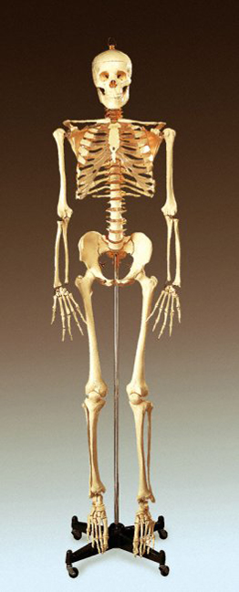Budget Bucky ™ Skeleton Stand- Stand features a heavy duty base on casters and a steel pole to attach to Bucky's spine. Adapters for attaching Bucky's spine are also included. light assembly required: Assembly and mounting of skeleton onto stand: insert pole into hole on base (wheels are already affixed to base) place brass colored adaptor over pole
