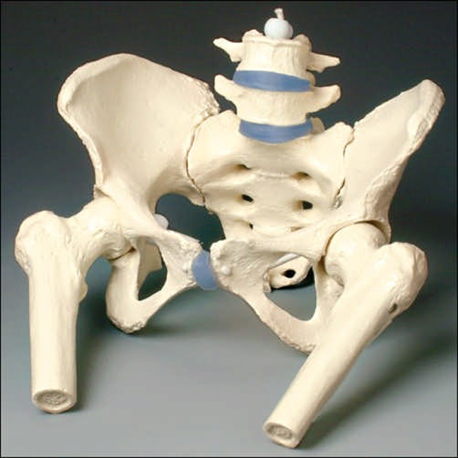A life size model of an adult female pelvis cast from an natural specimen. Includes the wings of the illium, sacrum, L4, L5 and femur heads. The 2 lumbar vertebrae are flexibly mounted with elastic cord. Movements of the iliosacral joint can be demonstrated. Sacrum is removable. The femur heads are completely moveable and may also be removed. Made in Germany by Erler-Zimmer Also available : Z4058 Female Pelvis Z4056 Male Pelvis included.