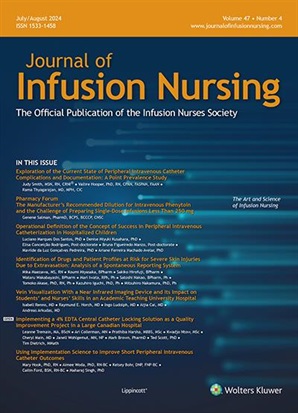 The only journal focusing exclusively on the practice of infusion therapy. Original articles provide the latest information on upgrading and implementing nursing skills and utilizing the newest equipment and techniques. Practical solutions, protocols and problem-solving in areas of med-surg, critical care, oncology nursing and homecare are presented in a readable format to help infusion nurses meet the increasing demands of their profession. This journal benefits all nurses involved in the delivery of infusion therapy.