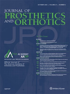 Published quarterly by the AAOP, JPO: Journal of Prosthetics and Orthotics provides information on new devices, fitting and fabrication techniques, and patient management experiences. The focus is on prosthetics and orthotics, with timely reports from related fields such as orthopaedic research, occupational therapy, physical therapy, orthopaedic surgery, amputation surgery, physical medicine, biomedical engineering, psychology, ethics, and gait analysis. Each issue contains research-based articles reviewed and approved by a highly qualified editorial board and an Academy self-study quiz offering two PCE's. Indexing:Journal of Prosthetics and Orthotics is cited in ExcerptaMedica; CINAHL, RECAL Information Services, AMED, SPORTDISCUS, NARIC, and Scopus.
