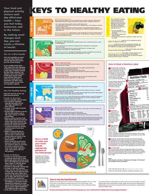 Keys to Healthy Eating Anatomical Chart 3E has been updated with changes from the USDA's 2010 Dietary Guidelines. This chart contains descriptions of the 5 major food groups- what's in them, and daily recommendations Explains and defines: types of oils and fats step by step guide on how to read a nutrition label how to use the food pyramid diagram of appropriate portion size Also includes tips for healthy eating Made in the USA. Available in the following versions :