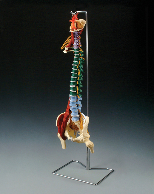 This flexible life-size model of a human spine with muscles also demonstrates some common spine disorders. Features the following: Color-coded spinal curvatures occipital bone and cerebellum circle of Willis vertebral artery spinal nerves sciatic nerve right brachial plexus 1st and 2nd ribs sacroiliac ligaments