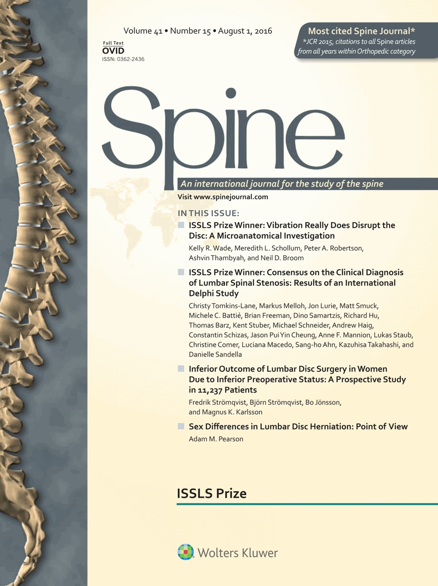 Recognized internationally as the leading journal in its field, Spine is the place to turn for objective and authoritative information on diagnosing and treating spinal deformity and dysfunction. A world-renowned group of editors and editorial board members brings readers a unique multidisciplinary approach that explores the current views of specialists in every discipline concerned with spinal disorders including anatomy, physiology, biochemistry and biomechanics. Spine continues to advance the field by presenting important original research and groundbreaking papers that influence how you and your colleagues practice every day, improving quality of care and outcomes for patients globally.