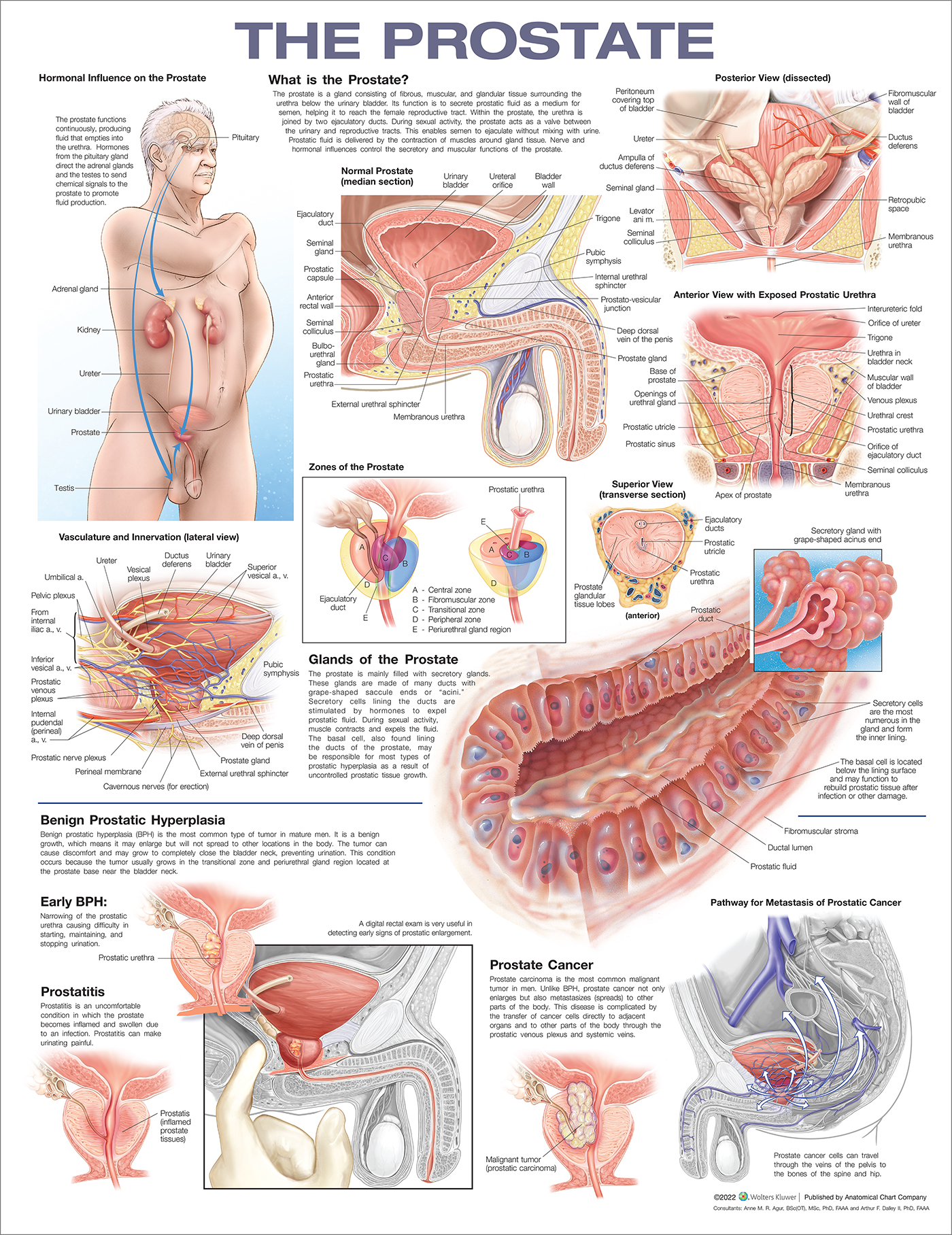 The Prostate Anatomical Chart, Second Edition clearly defines the prostate and includes several illustrated views of the organ and surrounding structures along with vasculature, innervation, and zones of the prostate. The chart also describes and shows hormonal influence on the prostate, benign prostatic hyperplasia (BPH), early BPH, prostatitis, digital rectal exam, prostate cancer, and pathway for metastasis of prostatic cancer.