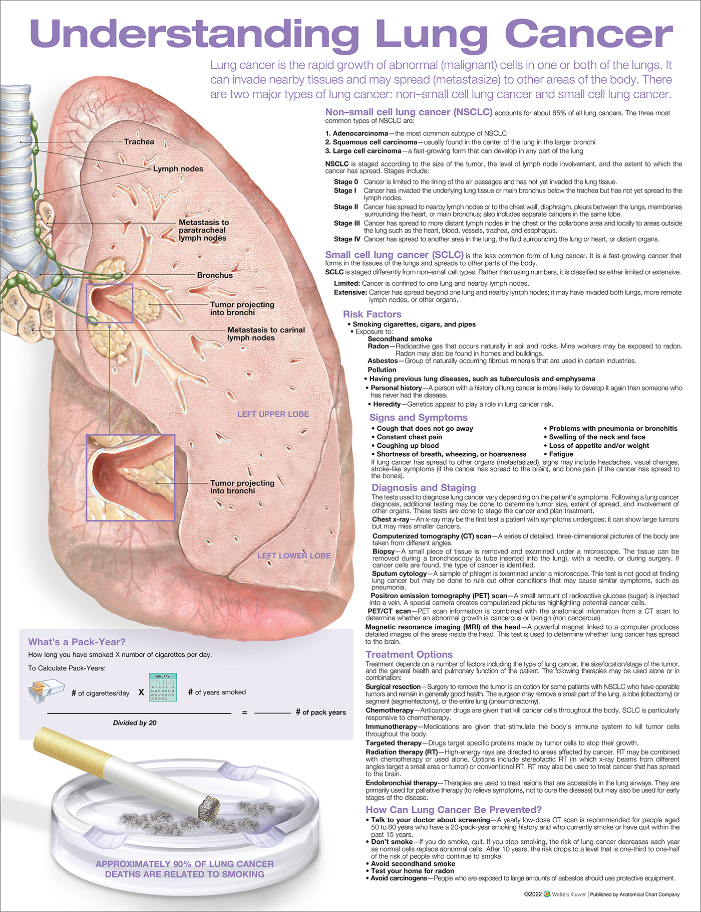 The chart also describes how lung cancer can be prevented, includes a graphic showing how to calculate number of “pack years” along with an image of a cigarette in ashtray and the statistic that approximately 90 percent of lung cancer deaths are related to smoking.