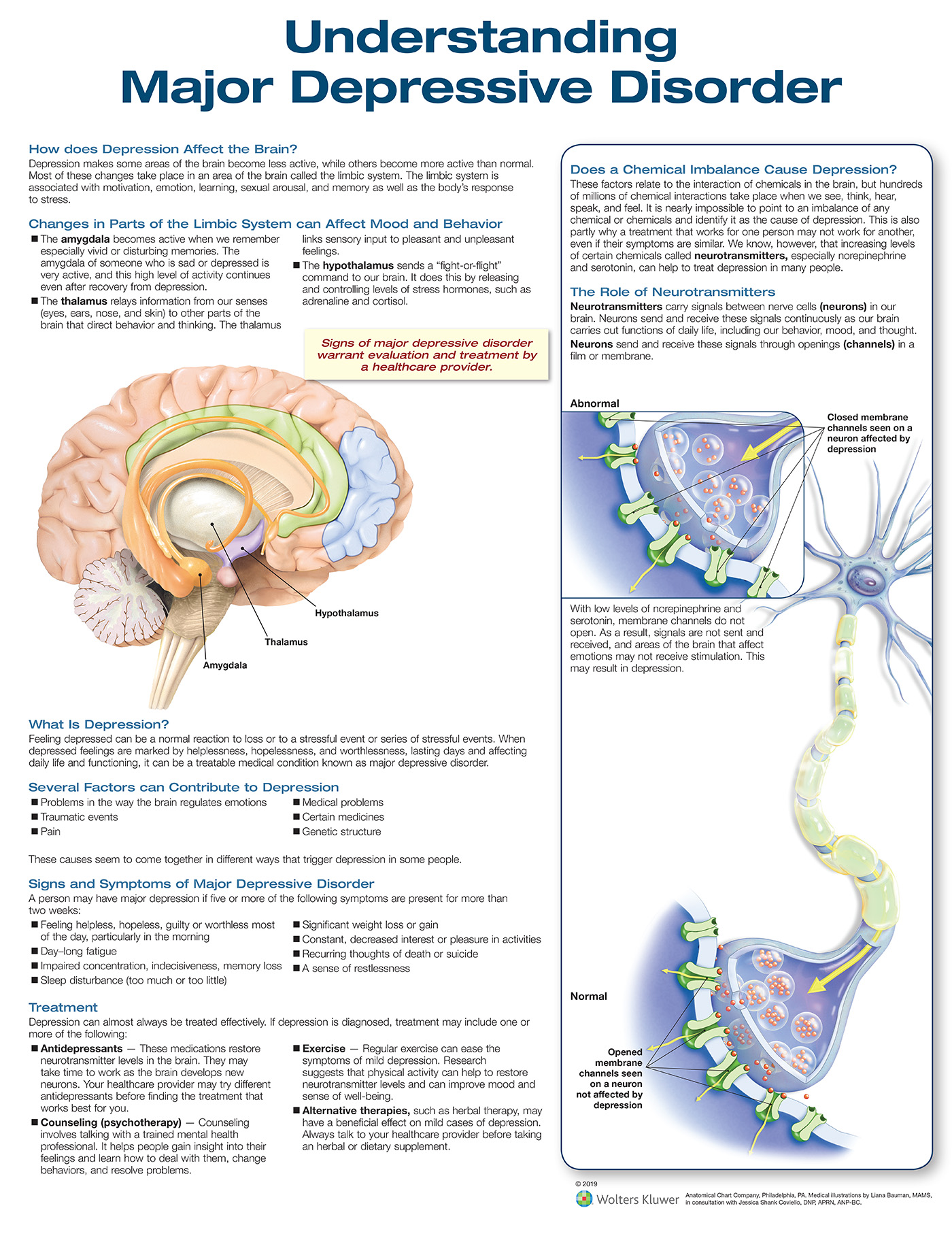Understanding Major Depressive Disorder, Third Edition anatomical chart features sections that define depression and describe how it affects the brain, contributing factors, signs and symptoms, and treatment, including an illustrated box on the role of neurotransmitters.