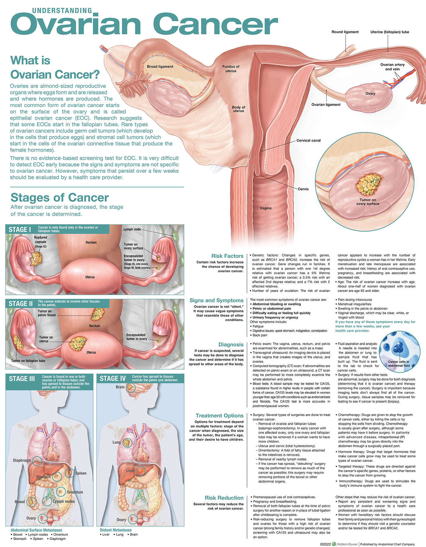 Understanding Ovarian Cancer, Second Edition, provides essential information on ovarian cancer in a highly illustrated, easy-to-understand manner. The second edition has been completely revised, bringing it up to date with current guidelines. This chart defines ovarian cancer and includes updated information on risk factors, signs and symptoms, and diagnosis, among other areas. It also illustrates and describes stages I through IV of ovarian cancer, showing locations of cancer spread.