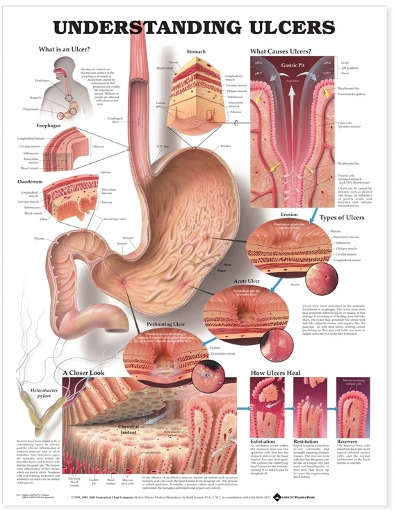Our Understanding Ulcers chart defines what an ulcer is. Clearly labeled illustrations show: anatomy of the stomach, esophagus,and duodenum and location in the body cross section views of esophagus, duodenum, and stomach layers diagrams showing what causes ulcers cross section views and photographs of the types of ulcers (erosion, acute and perforating) illustrates how ulcers heal detail of h.pylori Made in USA